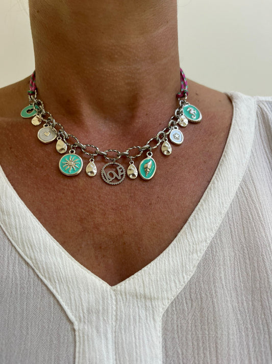 Ketting zilver met koord en aqua en witte bedels
