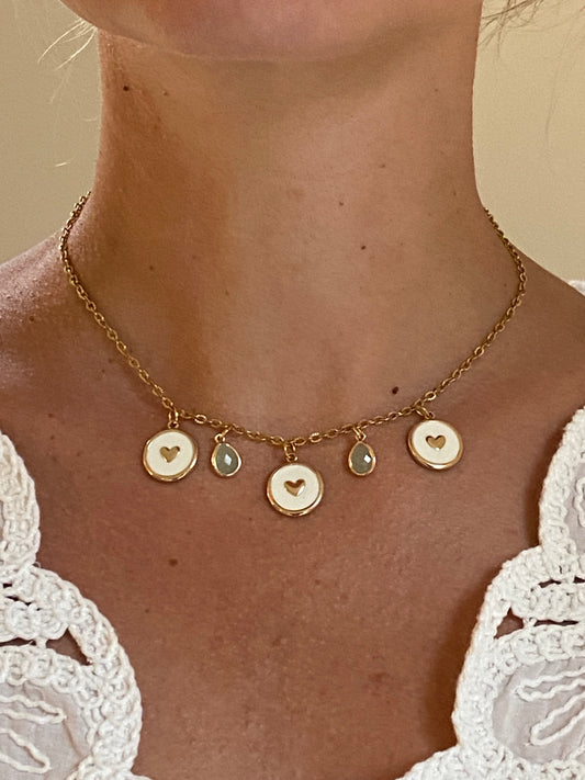 fijne ketting goud met vijf twee opale bedels en drie met wit en gouden hart